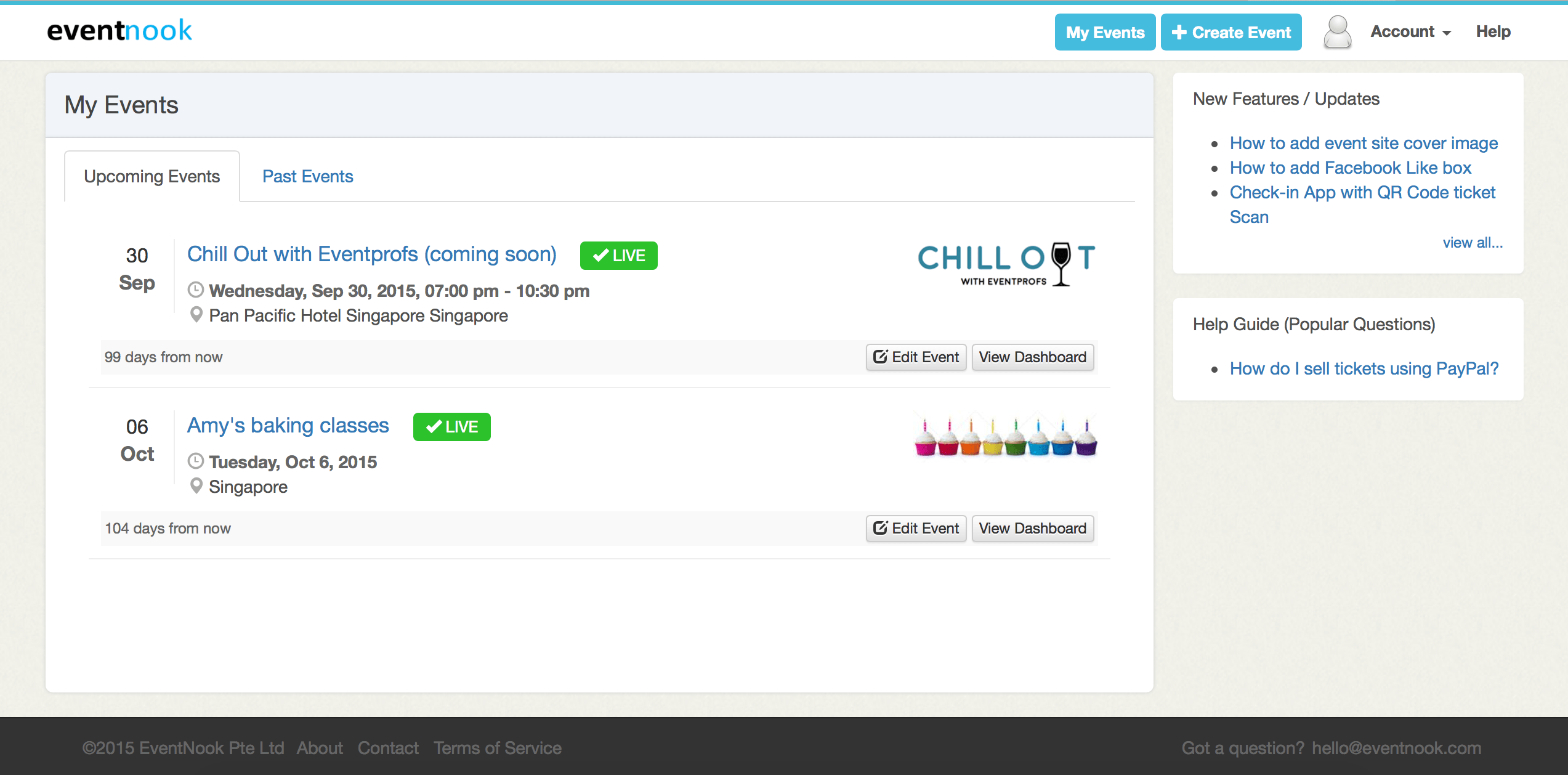 At the right column, we have added two fields of ‘New Features/Updates’ and ‘Help Guide (Popular Questions)’. This will keep you updated and informed of how you can best make use of EventNook’s features for your events.